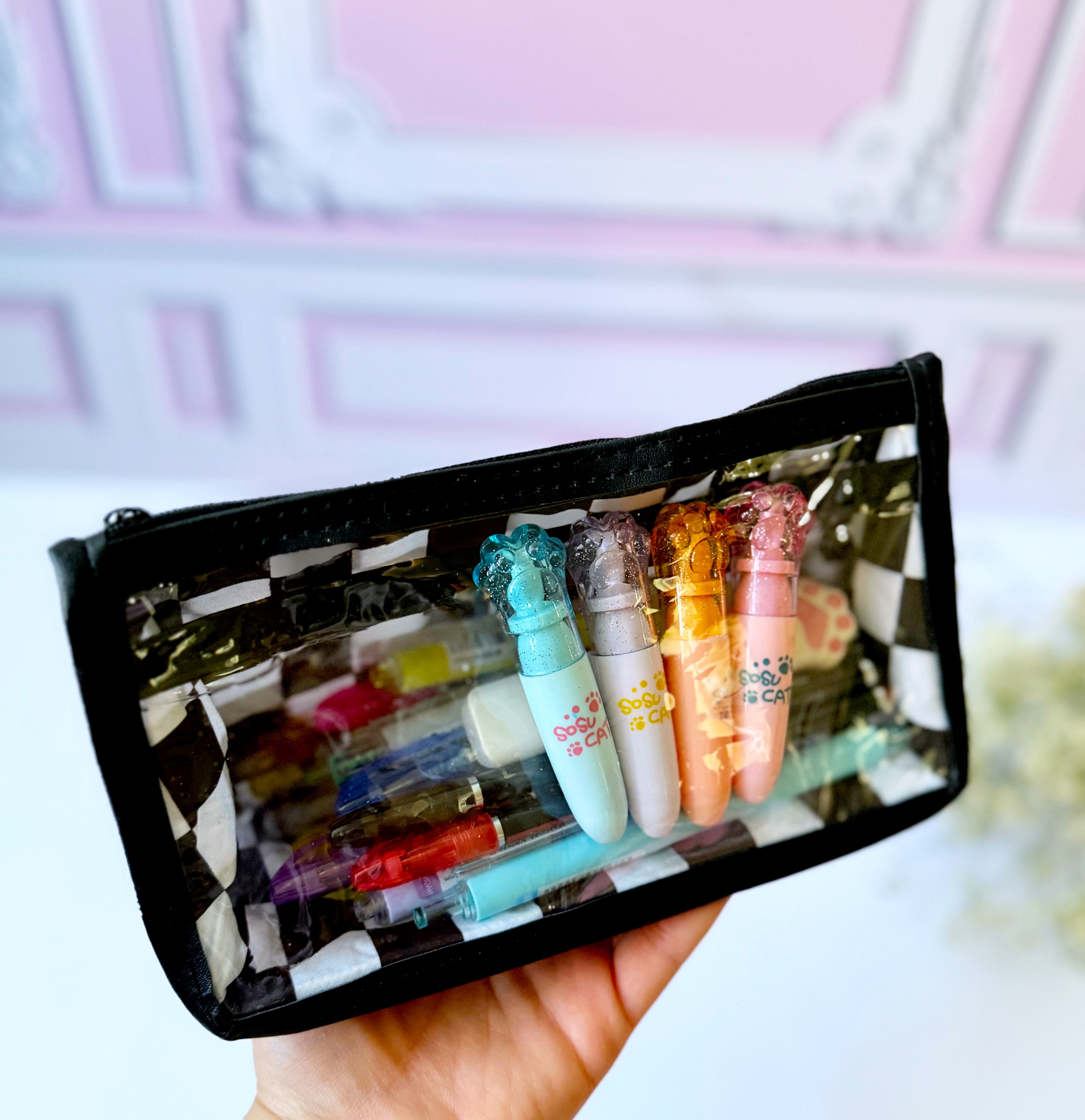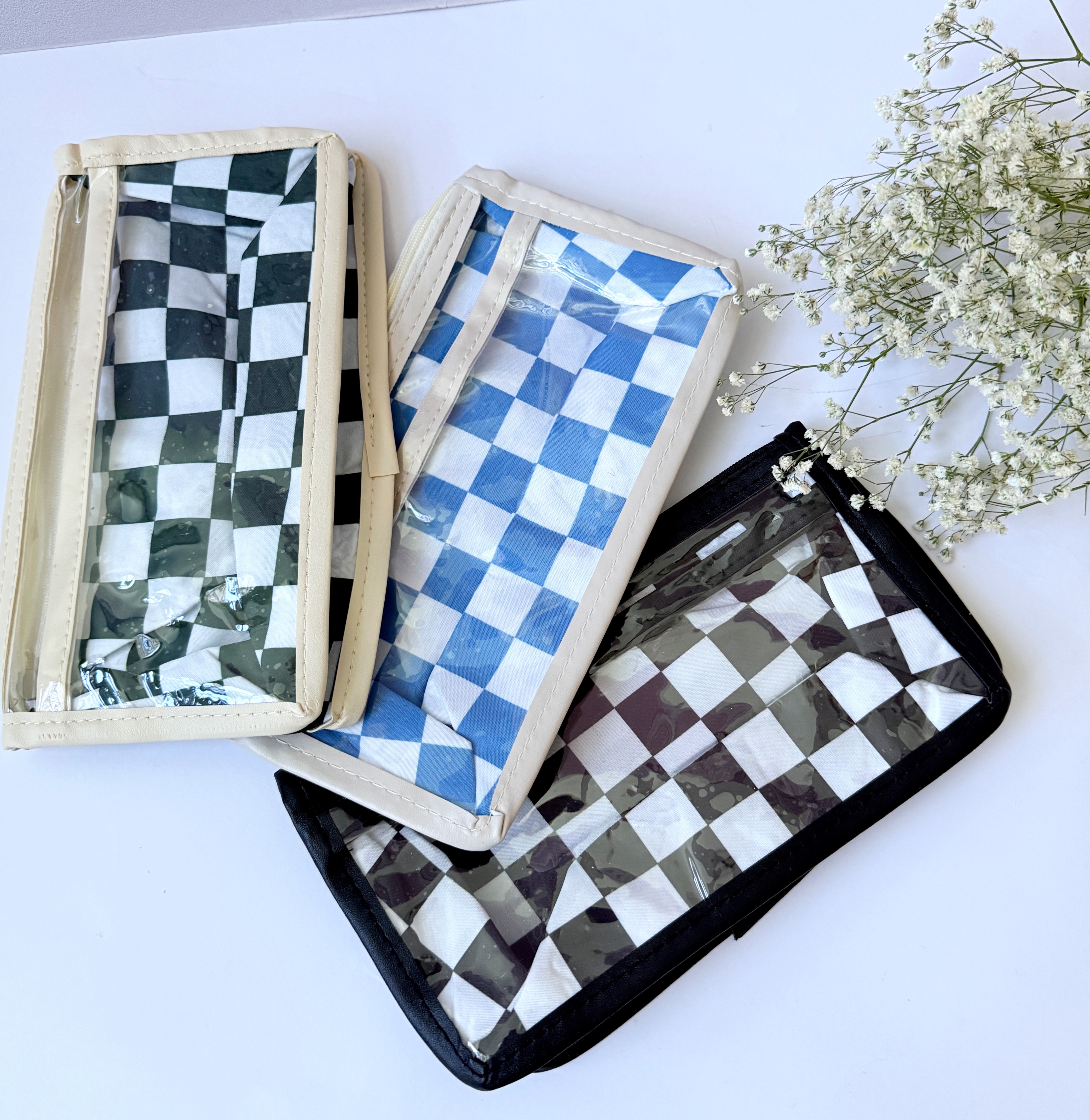 جامدادی پارچه ای و دور دوز چرمی رویه جامدادی شفاف است یک جیب زیپ دار و یک جیب طلقی شفاف دارد ابعاد:۲۰*۷*۱۲ برند معروف موکا